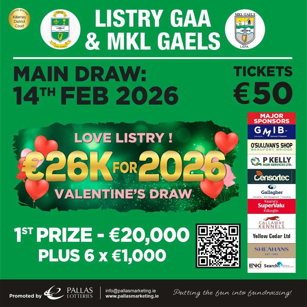 Just wanted to let you know about a super draw being run by Listry GAA Club and MKL Gaels. The main prize is €20,000 along with 6 other €1,000 prizes. Tickets are just €50 and if you can make a syndicate and buy 6 tickets, you will get an extra 2 free tickets and if you buy 10 tickets, you will get an extra 5 free tickets. If you can support our clubs, please send me a👍. To buy a ticket or tickets just click on the link …. and if you buy your ticket before 4pm next Friday (16th) you are in a bonus draw to win two tickets for the 2026 All Ireland Football Final + €500 spending money. Thanks a million.